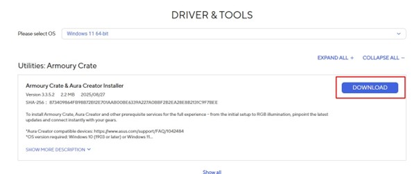 - Najprej obiščite https://go.uvi.gg/ARMOURYDL in prenesite Armoury Crate (gumb “Download”)