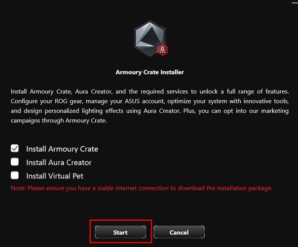 -  Namestite Armoury Crate in Aura Creator s klikom na gumb “Start”.